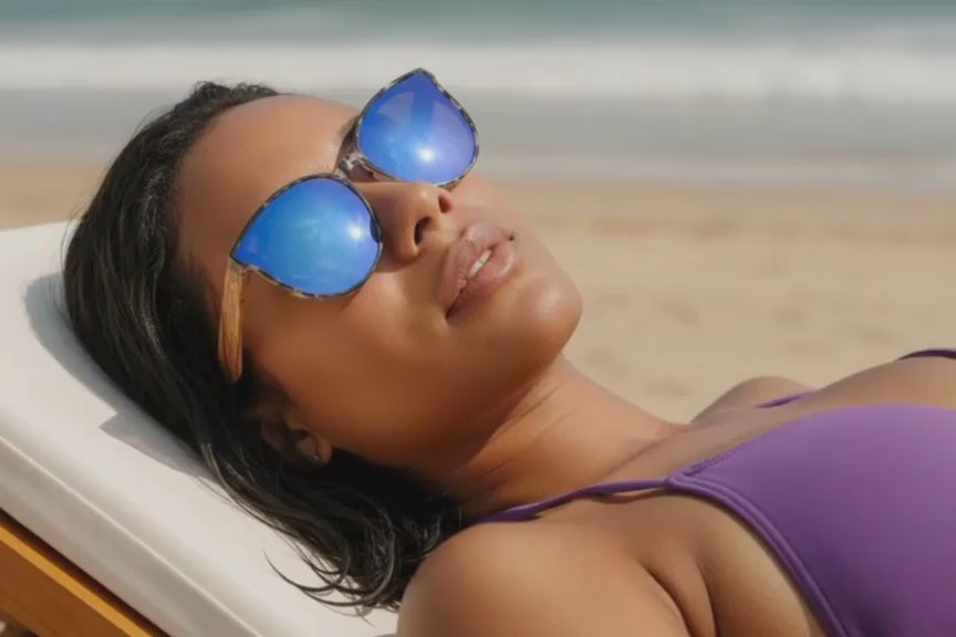 Unwind on the beach with our sustainable sunglasses, providing 100% UV protection. Enjoy nature's serenity, knowing your eco-friendly choice combines style and environmental responsibility for a greener future.